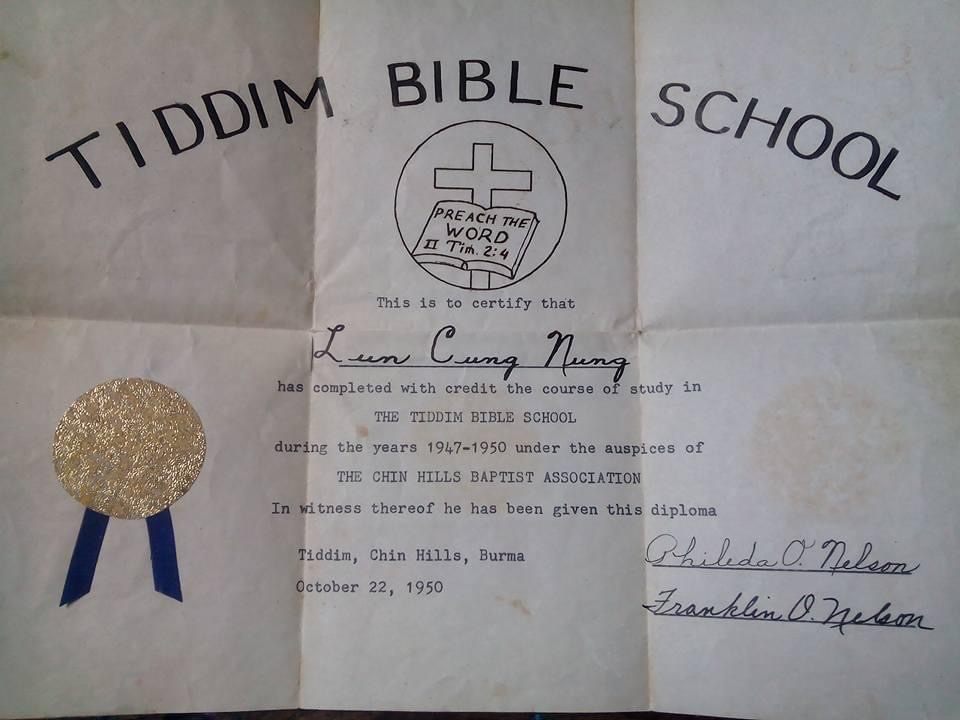 Pastor Lun Cung Nung cu ca a thiam tuk ruang ah B.Th degree cu kum khat in sui ta sik an pek ih an theh ter a si, ti in a pu pa Rev Cio Lian le a nau pa pu Ceu Ling le a tu le pawl nih in sim a si. 1951 kum Insein Seminary ih sin B.Th a theh a si .